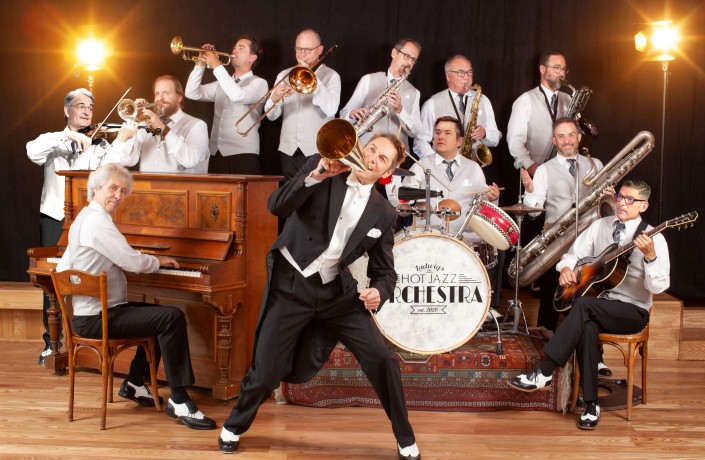 Wir zaubern Ihnen ein Lächeln ins Gesicht mit der herrlichen Musik der Roaring 20s Erleben Sie Songraritäten der besten Orchester der 1920er und 1930er Jahre im authentischen Sound und gespielt von hervorragenden Jazz-Solisten. In der großen Zeit des Jazz - bezeichnenderweise gleichzeitig Prohibitionszeit von 1920 bis 1933 in den USA - beherrschen schwere Jungs und leichte Mädchen die Szene, im Untergrund verschiebt Al Capone den verbotenen Alkohol, auf der Leinwand flimmern die Meisterwerke von Laurel & Hardy, Josephine Baker tanzt im Bananenrock Charleston, ein Mann verlässt das Haus nicht ohne Kopfbedeckung und die Damenwelt lässt sich einen Bubikopf schneiden. Neben wunderbaren Gesangsnummern kommen frühe Ellington-Kompositionen aus dem Harlemer Cotton-Club, Hits des Ballsaal-Giganten Jean Goldkette oder Songs aus Stan & Ollie-Filmen in handverlesenen Original-Arrangements als Gehör-Schmeichler und Fuß-Taktgeber auf die Bühne. Den zwölf Gentlemen eilt ein exzellenter Ruf voraus und sie werden ihre betörend nostalgische Musik in eleganter Virtuosität und stilvoller Garderobe präsentieren. Freuen Sie sich auf heiße Rhythmen der Goldenen Zwanziger, den Schmelz in Enrico Orlandis Stimme und Uwe Ladwigs amüsante Conférence durch die Geschichte der frühen Jazzorchester.