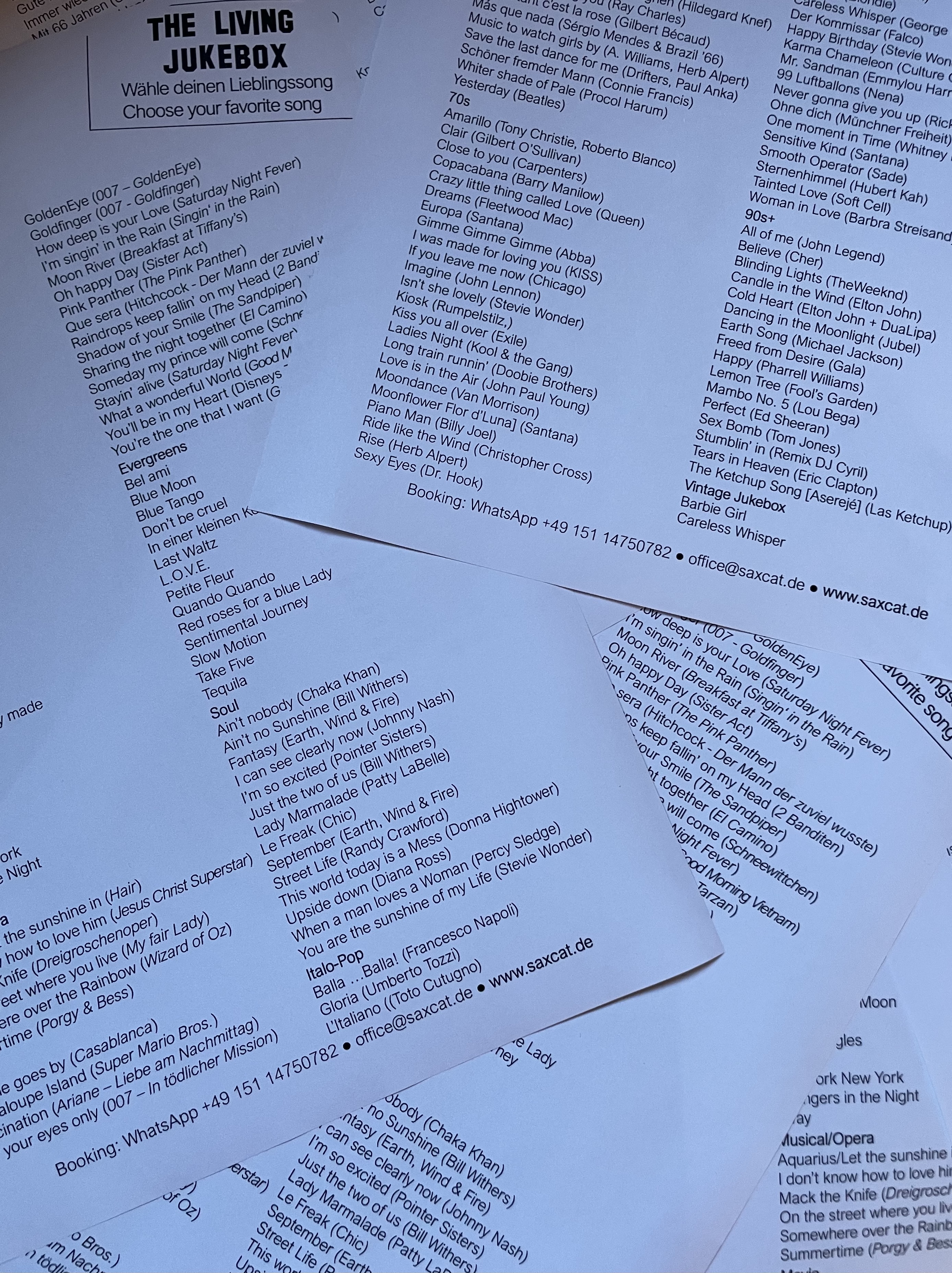 - Zusätzlich buchbar: Conférence mit Musik mit Vorstellung von Soprano-, Tenor- und Bass-Saxofon (etwa 30 Minuten): Die Geschichte von Adolphe Sax und seiner besten Erfindung.